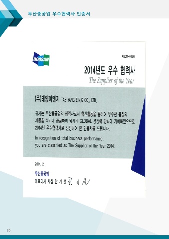 두산중공업 우수협력사 인증서 30