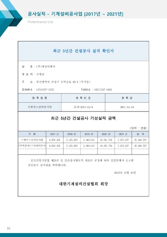 공사실적 – 기계설비공사업 [2017년 ~ 2021년] Performance List 51