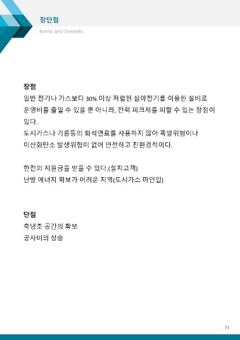 장단점 Merits and Demerits 장점 일반 전기나 가스보다 30% 이상 저렴한 심야전기를 이용한 설비로 운영비를 줄일 수 있을 뿐 아니라, 전력 피크제를 피할 수 있는 장점이 있다. 도시가스나 기름등의 화석연료를 사용하지 않아 폭발위험이나 이산화탄소 발생위험이 없어 안전하고 친환경적이다. 한전의 지원금을 받을 수 있다.(설치고객) 난방 에너지 확보가 어려운 지역(도시가스 미인입) 단점 축냉조 공간의 확보 공사비의 상승 71