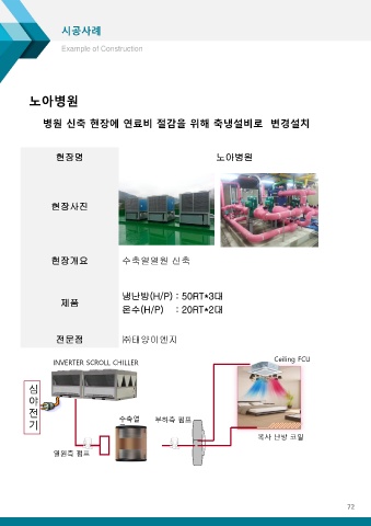 시공사례 Example of Construction 노아병원 병원 신축 현장에 연료비 절감을 위해 축냉설비로 변경설치 현장명 노아병원 현장사진 현장개요 수축열열원 신축 냉난방(H/P) : 50RT*3대 제품 온수(H/P) : 20RT*2대 전문점 ㈜태양이엔지 INVERTER SCROLL CHILLER Ceiling FCU 심 야 전 기 수축열 부하측 펌프 조 복사 난방 코일 열원측 펌프 72