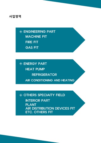 사업영역 ◈ ENGINEERING PART MACHINE FIT FIRE FIT GAS FIT ◈ ENERGY PART HEAT PUMP REFRIGERATOR AIR CONDITIONING AND HEATING ◈ OTHERS SPECIAITY FIELD INTERIOR PART PLANT AIR DISTRIBUTION DEVICES FIT ETC. OTHERS FIT 8