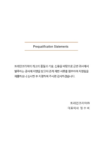 Prequalification Statements 트레인코리아의최고의품질과기술, 신용을바탕으로금번귀사에서 발주하는공사에지명을받고자관계제반서류를첨부하여지명원을 제출하오니심사한후지명하여주시면감사하겠습니다. 트레인코리아㈜ 대표이사 정 수 비
